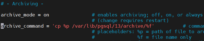 archive_command = 'cp %p /var/lib/pgsql/13/archive/%f'